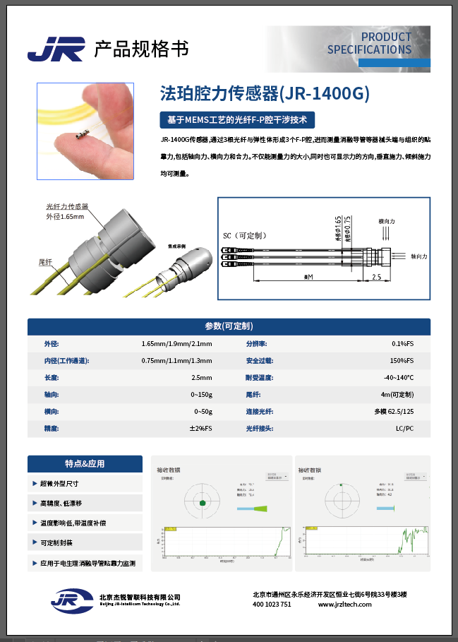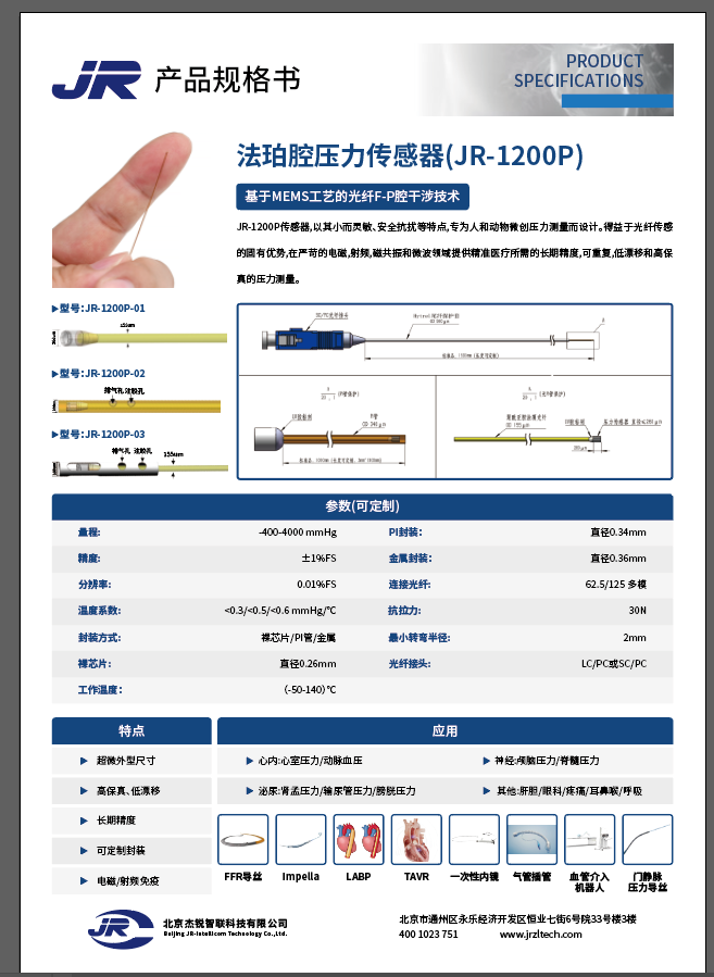 基于MEMS工艺的光纤F-P腔干涉技术的(JR-1200P)系列压力传感器,具有尺寸小,精度高,稳定性好,不受电磁干扰和耐腐蚀,可在恶劣环境下做可靠测量的特点;特别适合在临床,动物实验以及科学研究上用来测量或监控人体或动物体内特定位置的压力,由于其微小的尺寸,可以很方便的进入狭小的腔道或者与其他器械集成。