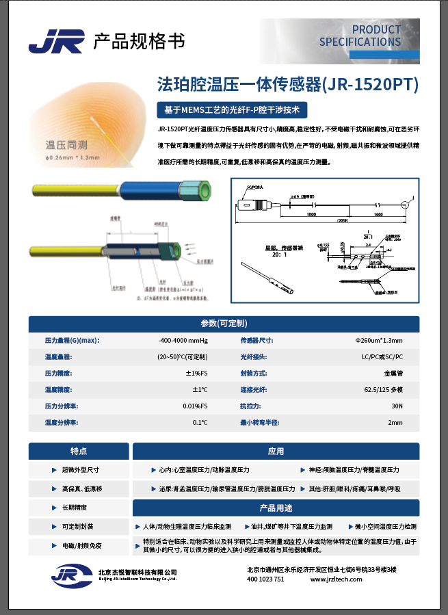 基于MEMS工艺的光纤F.P腔干涉技术JR-1520PT光纤温度压力传感器具有尺寸小,精度高,稳定性好,不受电磁干扰和耐腐饺,可在恶劣环境下微可靠测量的特点得益于光纤传感的固有优势,在严苛的电磁,射频,磁共振和被波领城提供精准医疗所需的长期精度,可重复,低源移和高保真的温度压力测量。